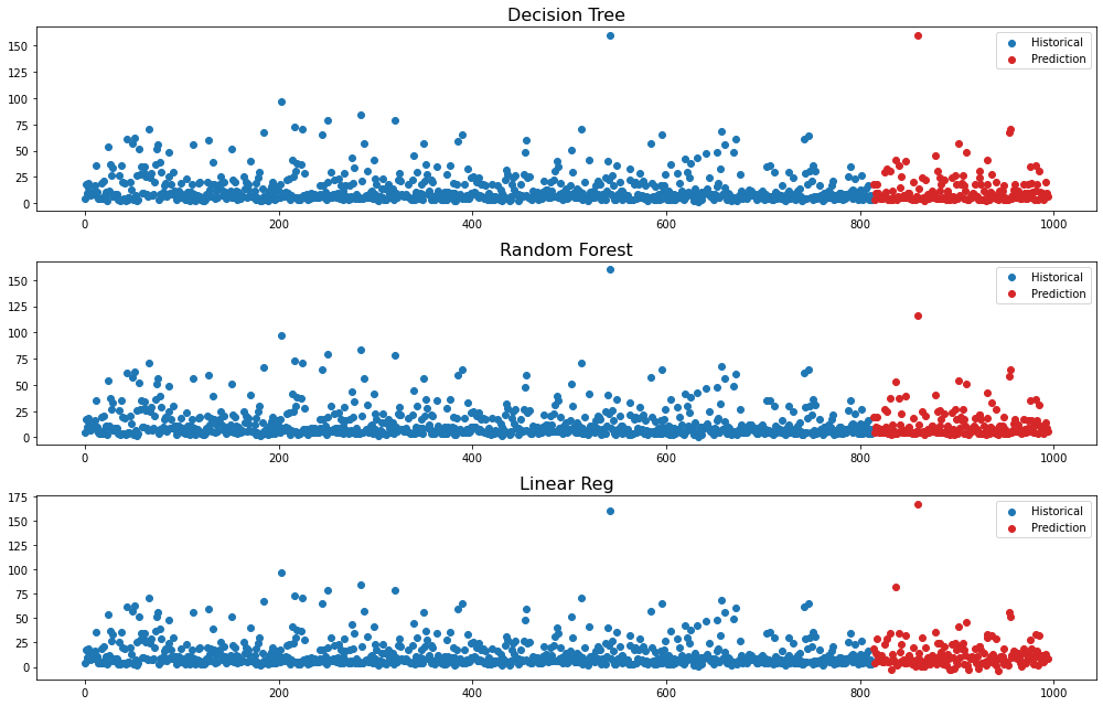 Predict New Prices: the package downloaded from Kaggle had a separate dataset with unknown used car prices that could be used for prediction. I run the same models against the new dataset and store all predictions in a dataframe. Plotting all three sets of predictios and with the known prices from the training dataset I get a visualization like this: