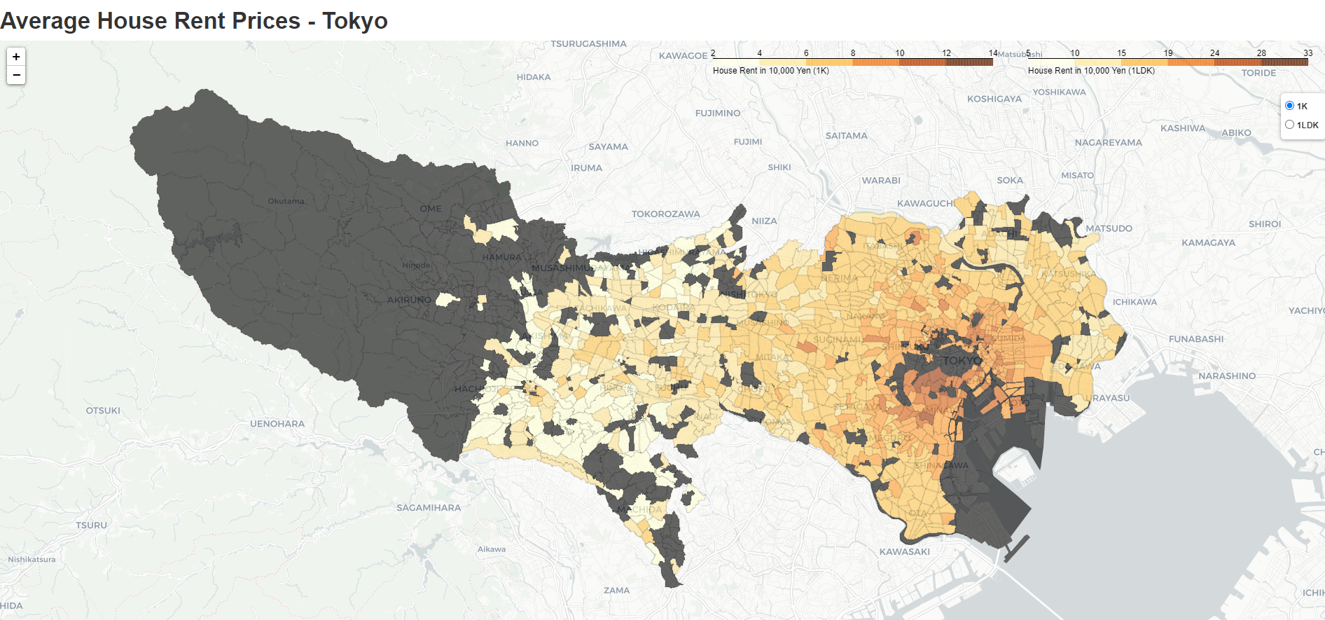 It would be nice to see a time series version of this map showing how areas that were yellow became brown over time (or vice-versa). Alternatively, it can be argued that Tokyo is an area where residential development has achieved its full potential a while ago, so a similar map showing changes in rent prices of neighboring prefectures could be more interesting (development has indeed been going on at fast pace in Chiba and Ibaraki). Unfortunately, that is not possible with the data I have at the moment.