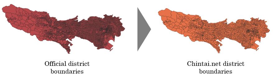 Geoprocessing: I realized that the districts scraped from chintai.com were not exactly the official district boundaries as defined by the Japanese government. Official boundaries were much smaller, so I had to group in (“Dissolve” in GIS jargon) some of these districts based on a less granular criteria to be able to merge it with the rent data. See an illustration of what I mean below: